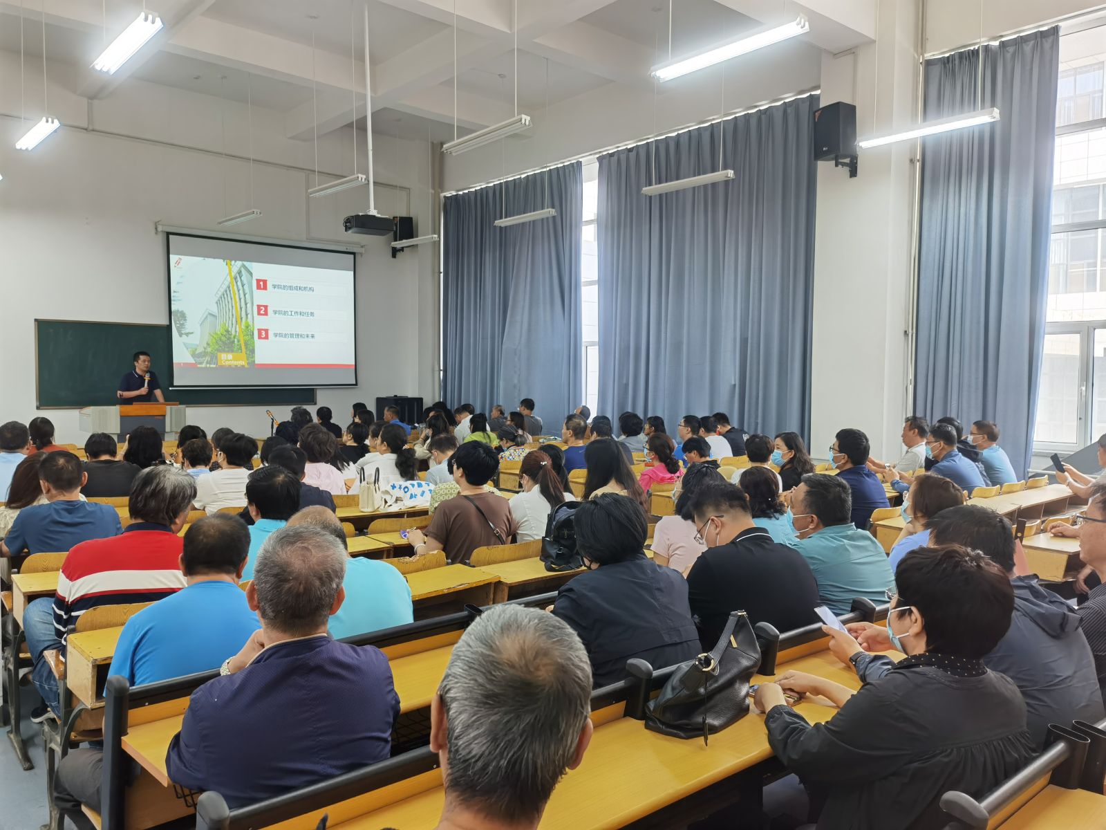 在学院A座202教室召开新学期全院教职工大会,全体教职工参会,院长王黎明主持会议并对新学期的工作做了安排部署。
