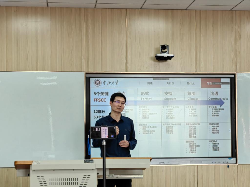 马春生教授从自己的名字引入一下子吸引了参与活动老师的注意力,接着由《应用学习科学》、《互动授课》两本书引入主题,然后结合自己多年的上课经验积累,从焦点、形式、支持、氛围、沟通五个关键,设定目标、创建内容、组织单元善用语言、设计有效视听教具、编写讲义与补充材料、认真备课、激发热情与兴趣、管理课堂、专业呈现、提问与回答、牢记要点等十二个部分,总体目的具体目的、SMART授课、学情分析、 授课风格等53个技巧进行了精彩阐述。借助现场内化思考探讨等教学手段,分享自身长期以来的教学实践经验。为广大教师呈现了一场幽默风趣、精彩纷呈的教学沙龙。