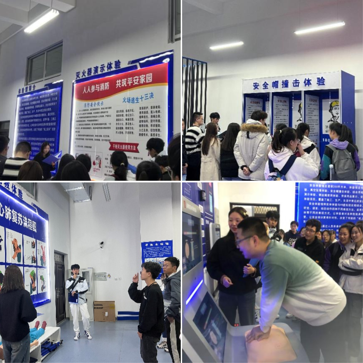 在培训中,安全体验馆人员带领学生开展了情景式安全教育、参与式体验教育等安全教育培训活动。结合示范动作,讲解遇险时自救的方法及注意事项等,指导学生进行模拟演练。本次体验活动包括灭火器演示、心肺复苏和海姆立克急救、触电体验、VR安全体验、宿舍等隐患排查、防护用品使用展示等13项培训内容。