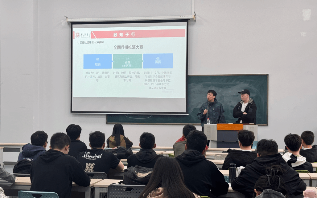 C204教室顺利举办。活动邀请中北大学兵器作战推演仿真协会技术部部长、太行兵棋智能博弈联合实验室技术骨干余乐阳同学及协会优秀学生代表于浩闻、李昭桦担任主讲,吸引全校百余名对兵棋推演、军事仿真感兴趣的同学到场参与。